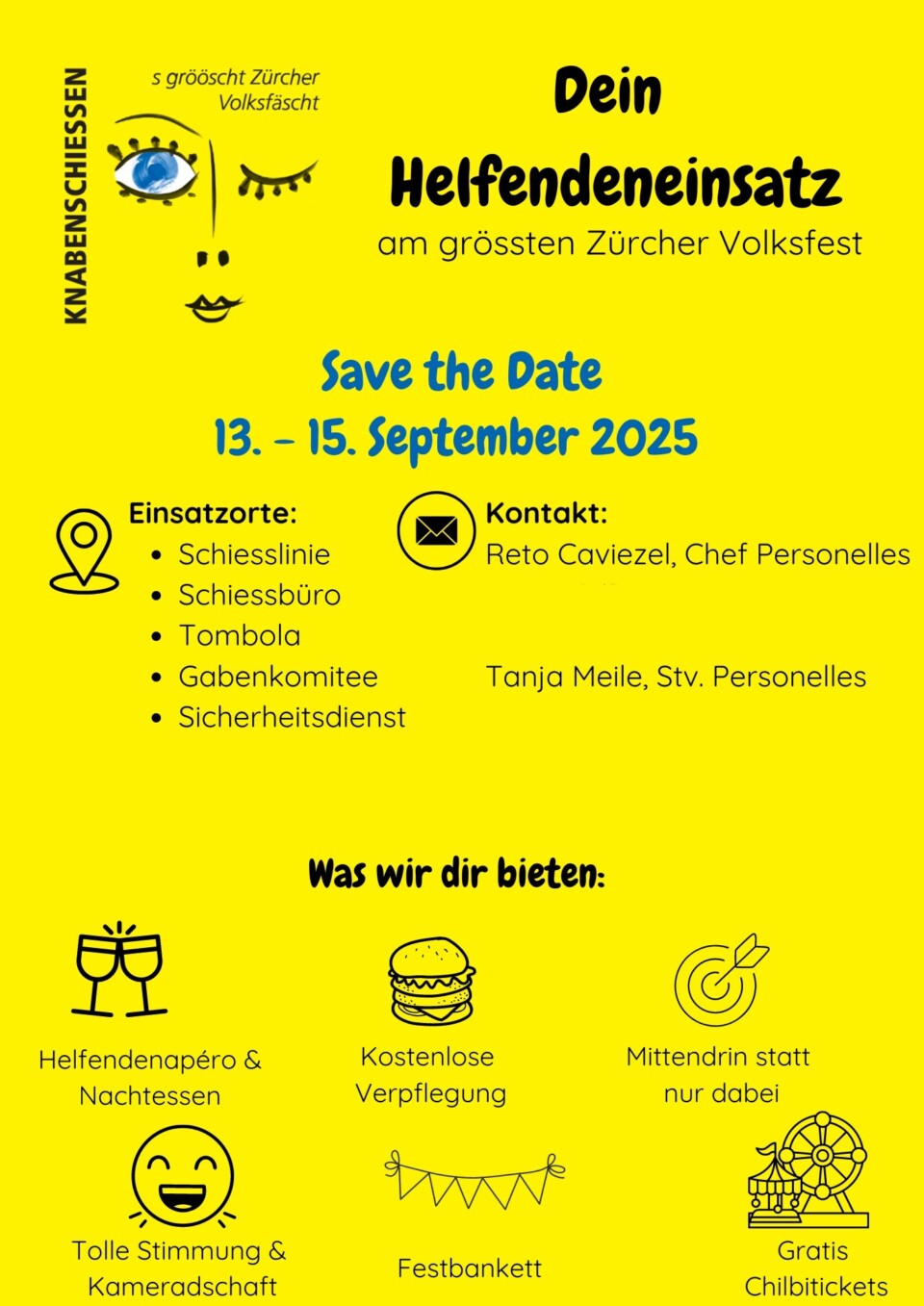 Das Knabenschiessen lebt von Engagement und Teamgeist – ohne unsere rund 300 freiwilligen Helfenden wäre es nicht möglich ein solchen Event zu stemmen. Ob bei den Vorbereitungen, dem Aufbau, während des Fests oder beim Abbau – jede helfende Hand zählt. Neue Helfende sind jederzeit willkommen.
